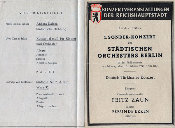 Fritz Zaun yönetimindeki Stadtischen Orchesters Berlin tarafından 1943/44 sezonunda, 18 Ekim 1943, saat 17.30’da verilen Alman-Türk konserinin program broşürü. Konserde Ulvi Cemal Erkin’in “Piyano Konçertosu” çalınmış, konçertoyu bestecinin eşi piyanist Ferhunde Erkin çalmıştır. Ayrıca Necil Kâzım Akses’in “Ankara Kalesi” de seslendirilmiştir. Ferhunde Erkin'in, eşi Ulvi Cemal Erkin'in piyano konçertosunu ilk kez seslendirdiği konseri dinleyen Almanya Büyükelçisi von Papen'ın girişimiyle, sanatçılar Almanya'dan konser daveti almışlar, II. Dünya Savaşı'nda tarafsızlık politikası izleyen İsmet İnönü Hükûmeti'nin onayı ile konser gerçekleşmiştir. Ferhunde Erkin, askerî uçak ile ulaştıkları Berlin'in aralıklarla bombalandığını, alarm sırasında sığınağa girildiğini, çıktıklarında daha önce gördükleri kimi binayı yıkılmış bulduklarını anılarında anlatır ve Alman halkının büyük serinkanlılık ve düzen içinde günlük yaşamlarını sürdürmesini, konser salonunun dolu olmasını derin takdirle anar. |
