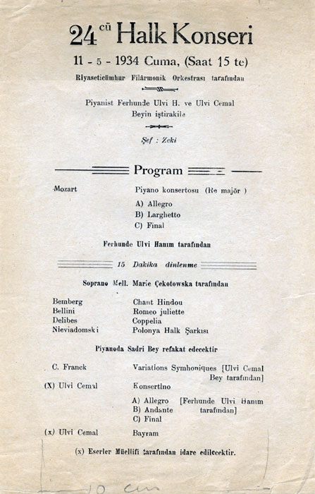 Ferhunde Erkin ve Ulvi Cemal Erkin’in Riyaseticumhur Filarmonik Orkestrası ile birlikte verdikleri konserin program broşürü;