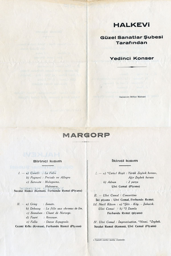Halkevi Güzel Sanatlar Şubesi tarafından verilen 7. konserin program broşürü. Konserde Ulvi Cemal, Cemal Reşit, Adnan (Saygun), Necil Kâzım’ın eserlerine de yer verilmektedir. Konserde piyano partilerini Ferhunde Remzi ve Ulvi Cemal, keman partilerini de Cezmi Rıfkı ve Necdet Remzi çalmaktadır. |