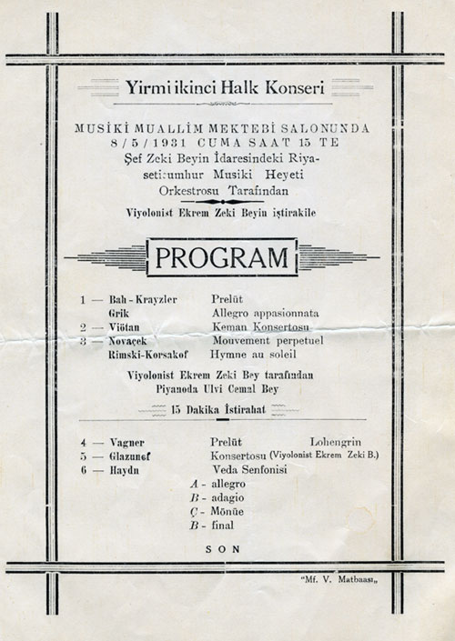 Musiki Muallim Mektebi Konser Salonu’nda 8 Mayıs 1931, Cuma günü saat 15.00’da Zeki bey (Üngör) idaresindeki Riyaseticumhur Musiki Heyeti Orkestrası tarafından verilen 22. Halk Konseri’nin program broşürü. Konserde solist olarak kemanda Ekrem Zeki (Ün) ve piyanoda Ulvi Cemal (Erkin) yer almaktadır. |