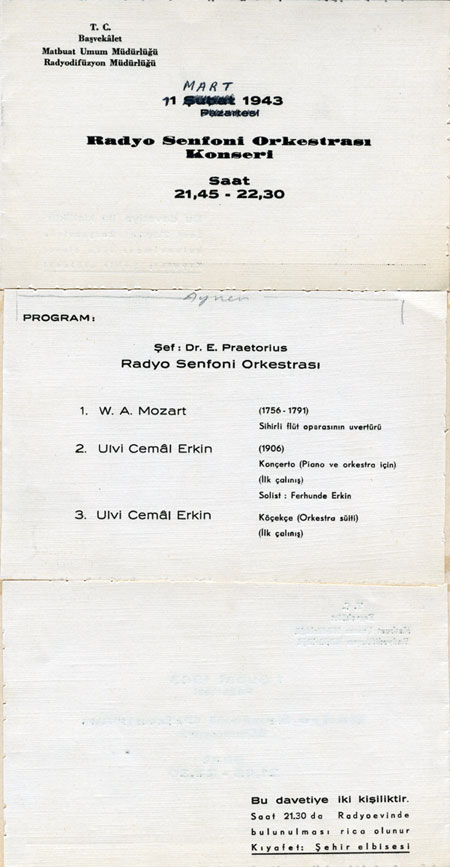 11 Mart 1943 Saat 21.45’te Dr. E. Praetorius yönetiminde Radyo Senfoni Orkestrası tarafından verilen ve Ulvi Cemal Erkin’in “Piyano Konçertosu” ve “Köçekçe” eserlerinin dünya prömiyeri yapıldığı Radyoevi’nde yapılan konserin davetiyesi. Konçertoda Ulvi Cemal Erkin’in eşi Ferhunde Erkin solist olarak yer almıştır. |